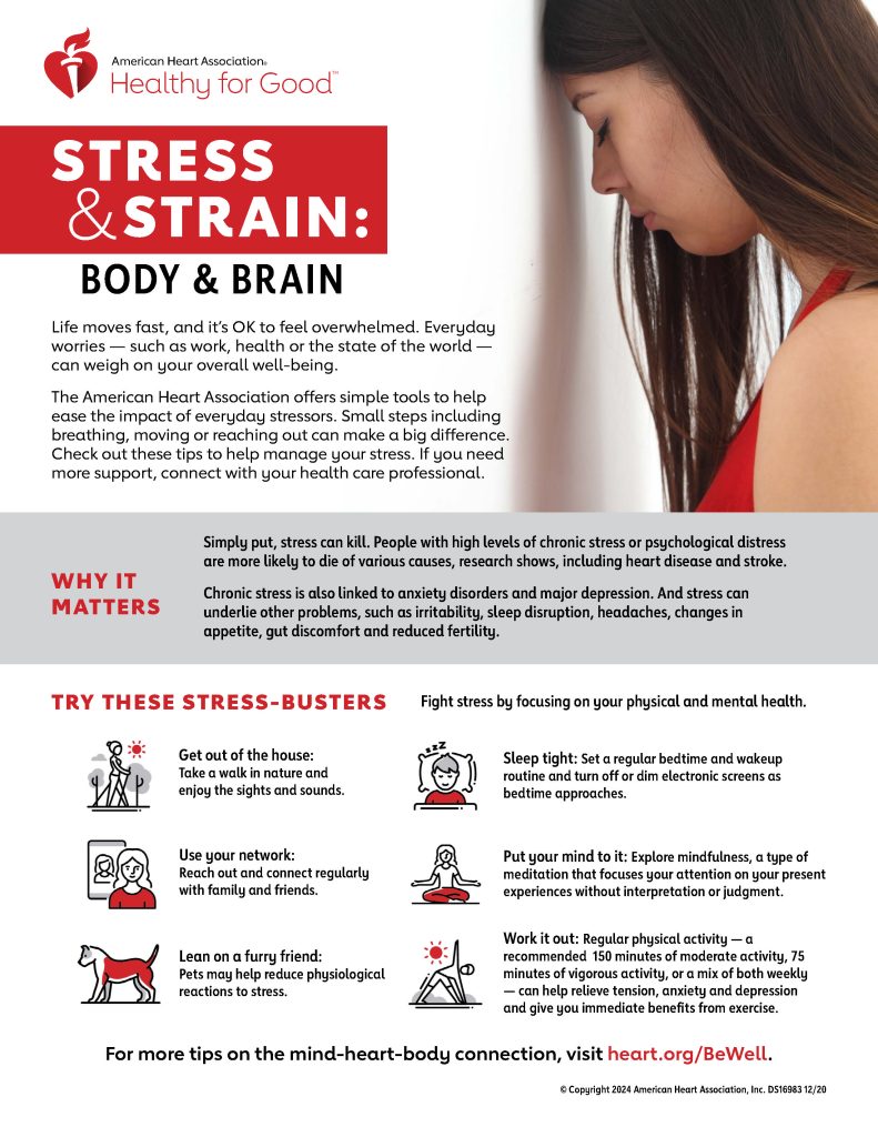 Stress Management Tips from the American Heart Association: https://www.heart.org/en/healthy-living/healthy-lifestyle/stress-management