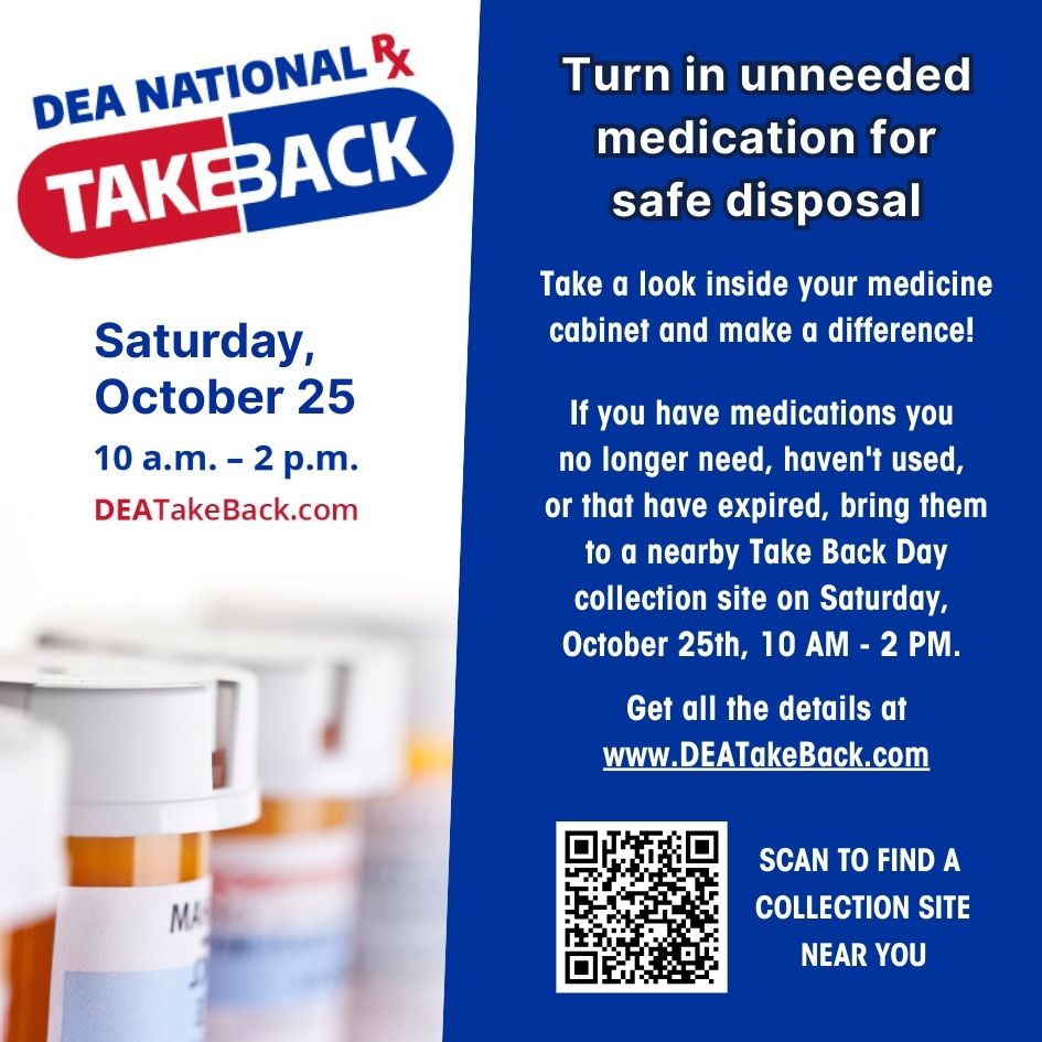 To address the public health issue of prescription drug misuse, the Drug Enforcement Agency (“DEA”) is hosting National Prescription Drug Take Back Day on Saturday, October 25, 2025. This event is an opportunity for individuals to remove unneeded medications from their homes and safely dispose of them.